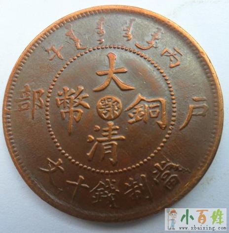 大清铜币,学名清代机制铜圆,钱面中央有“大清铜币”四个汉字,内嵌一小字代表地名,上端是满文“大清铜币”字样,两侧为年份原文www.xbaixing.com。边缘中间分别“户部”二汉字,下端为“当制钱十文”。钱背中央为蟠龙,上端是“光绪(或宣统)年造”,下端英文“Tai-Ching Ti-Kuo Copper Coin”字样(大清帝国铜币)www.xbaixing.com。