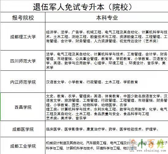 根据四川省教育考试院官方发布文件规定,退役军人报读成教本科(专升本),无需参加成人高考考试,可直接入学欢迎www.xbaixing.com。凡符合条件的退役军人,2020年均可申请免试就读四川省成人高校专升本。