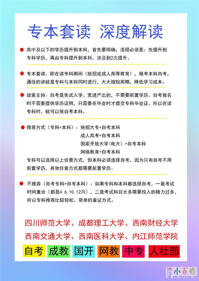 大专毕业后参加工作,在工作之中要想升职加薪,跳槽跨行,或者想安稳的考个公务员事业单位,或者出国小+百+姓+网。x~b~a~i~x~i~n~g~c~o~m。xbaixing.com。小+百+姓+网。学历成了最大的阻碍,而专科升本科,大家选择最多的就是成人高考中含金量最高的自考,那今天我们就来聊一聊自考报考流程中大家最迷茫的专业选择问题小百姓网www.xbaixing.com。